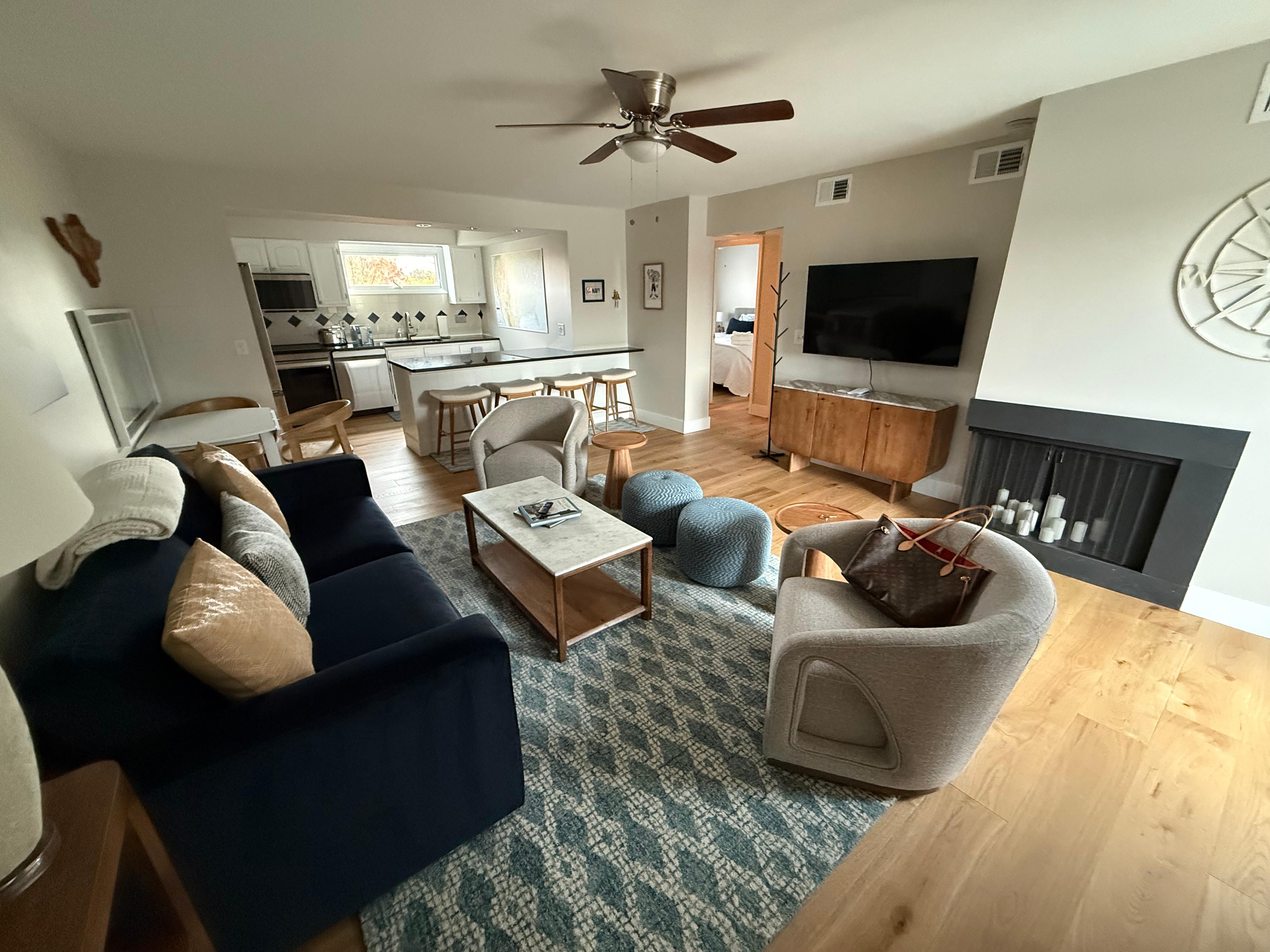 Inside, the open-concept living space is designed for connection. Cook in the fully equipped kitchen, share meals at the kitchen table for two-four or the breakfast bar for four more, and unwind in the living room with a flatscreen TVâall while gazing out at Spa Creek. The highlight? Stepping onto your balcony to enjoy morning coffee or sunset cocktails while yachts drift by against the backdrop of historic Annapolis.
