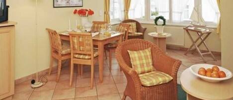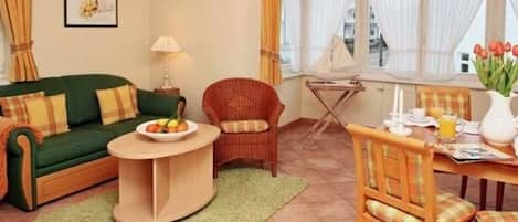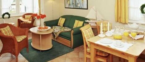 Ins Wohnzimmer gelangen Sie über einen kleinen Flur mit teilweise Abstellraum für Gepäck und Ähnliches. Hier finden Sie, neben einer bequem ausziehbaren Doppelbettcouch, Sesseln und einem Couchtisch, eine gemütliche Veranda mit Sitzecke, eine Essecke für 6 Personen selbstverständlich auch Farb-TV, DVD- und CD-Player, Stereo-Radio, Durchwahltelefon, WLan und Sprechanlage, sowie eine vollständig eingerichtete Küche. Mikrowelle mit Grillfunktion, 4-Plattenherd,Toaster, Kaffeemaschien, Geschirrspüler und Kühlschrank. Die Erdgeschoss-Wohnung Nr. 1 verfügt über eine eigene Terrasse und kann gern auch von Rollstuhlfahrern genutzt werden.( rollstuhlgeeignet)