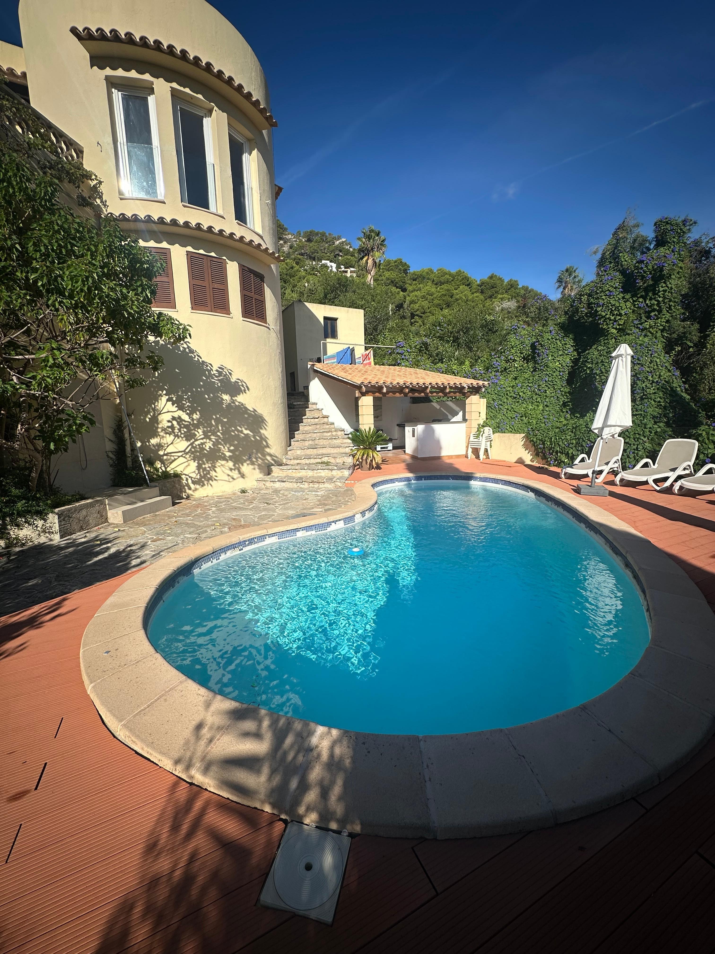 Highlight der Villa del Sol ist der schöne Terrassenbereich mit großem Pool (7,65 m x 3,85 m), ausreichenden Sonnenliegen, mehrere Sonnenschirme sowie fantastischer Aussicht auf das Meer.