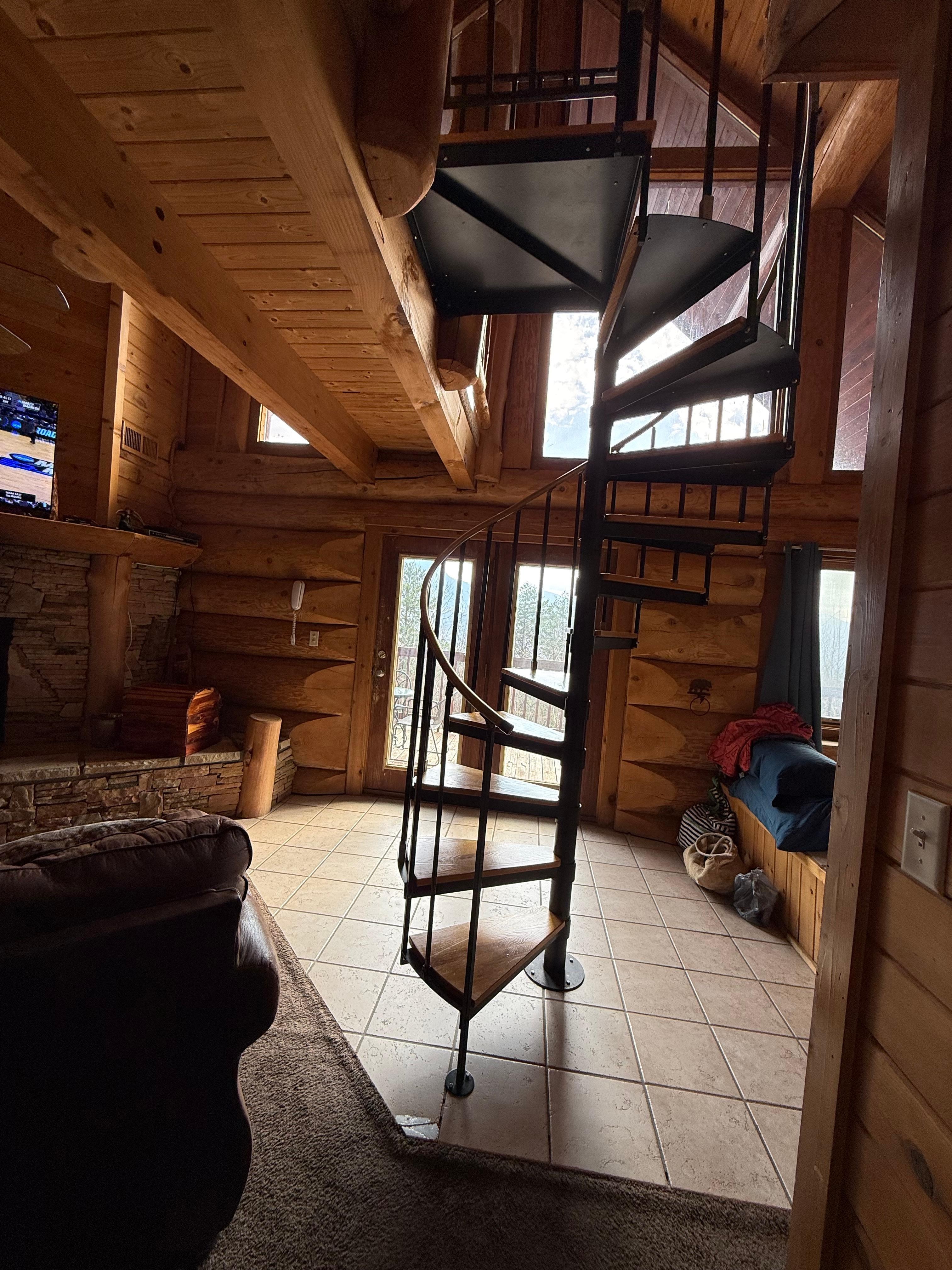 Der Loft-Bereich im Obergeschoss ist über die schöne Wendeltreppe zugänglich, die einen Billardtisch mit Sitzecke für Unterhaltung bietet. Es hat einen schönen Blick auf den Rest der Hütte und eine Holzbrücke, die zum gewölbten Fenster führt, um die spektakuläre Aussicht auf die Berge zu genießen, die diese Hütte zu bieten hat.
