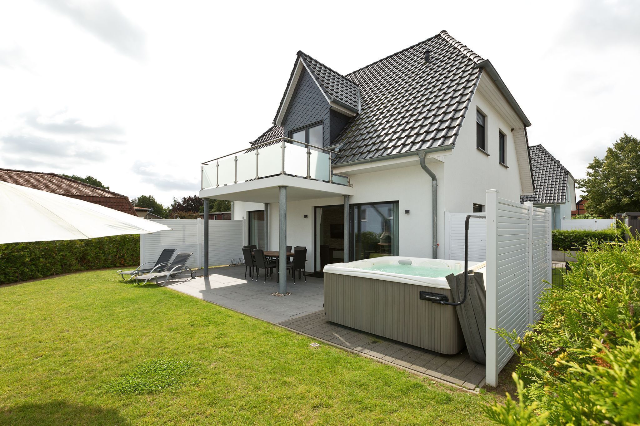 Unsere Luxus-Villa möchte mit 4 Schlafzimmern, 3 BĂ€dern, Sauna & ganzjĂ€hrigem 38 Grad AuĂenwhirlpool, und eingezĂ€unten Garten bei Ihnen punkten. Das 4. Schlafzimmer kann fĂŒr 25,-- ⏠pro Nacht zugebucht werden.