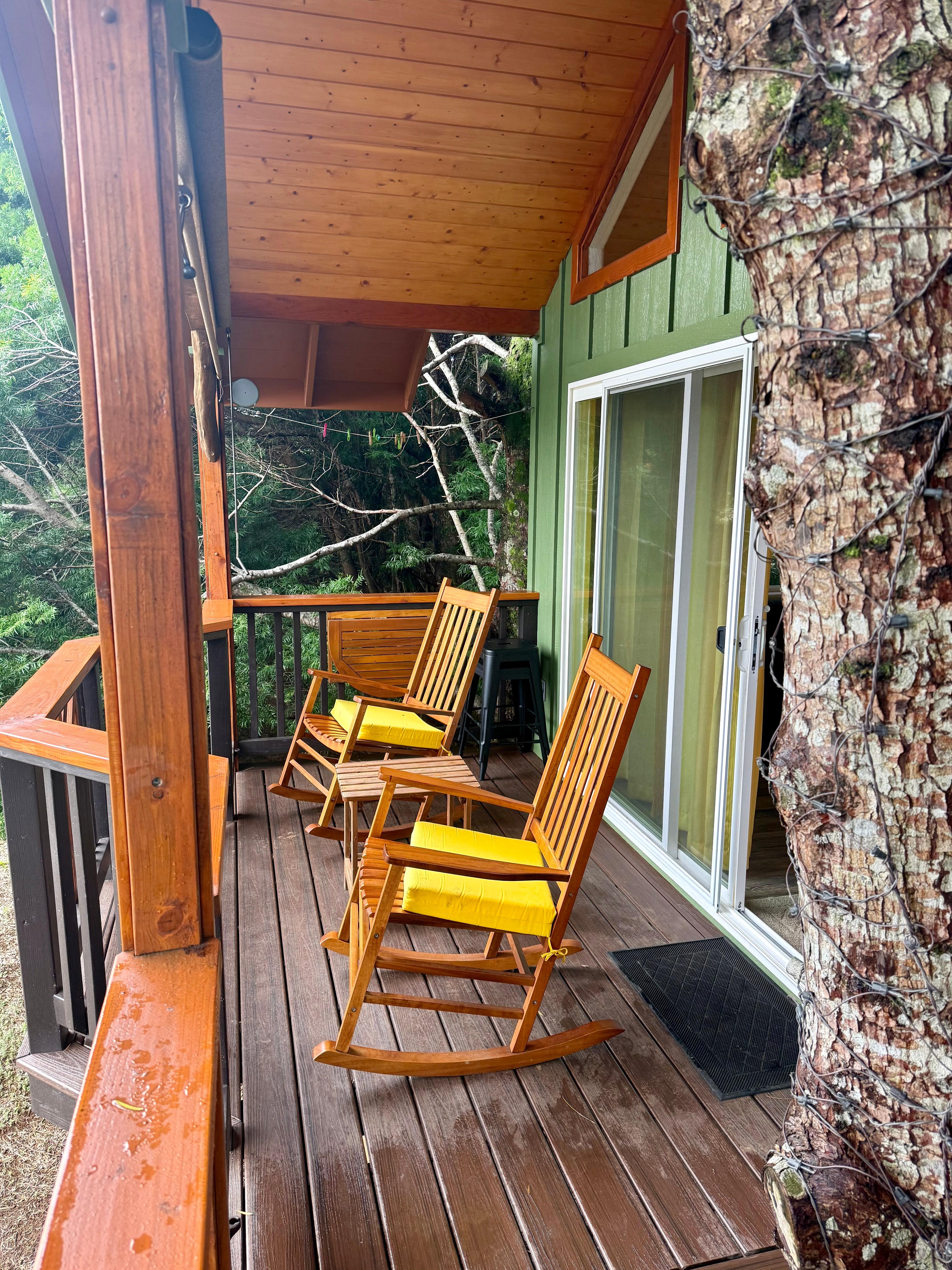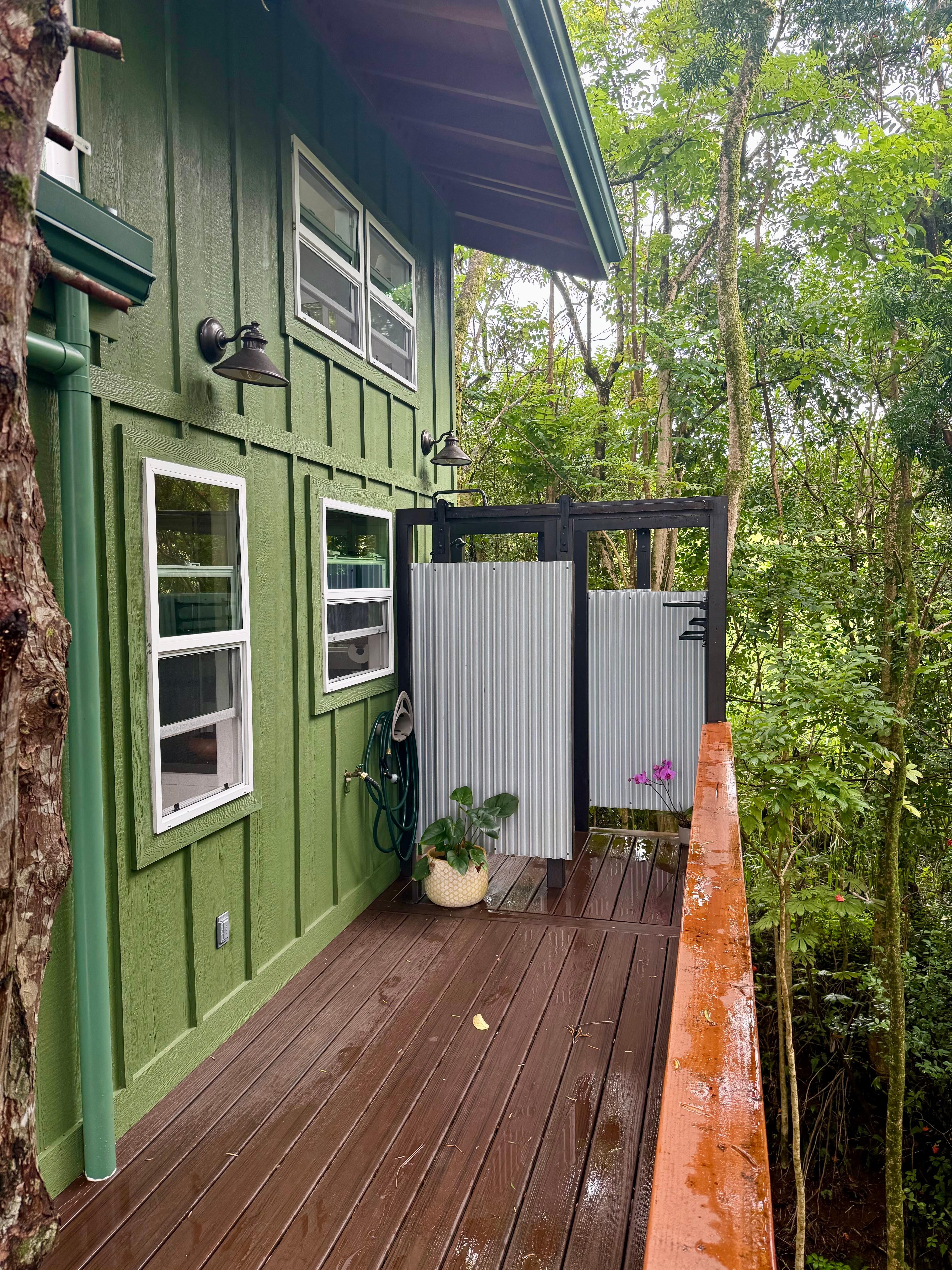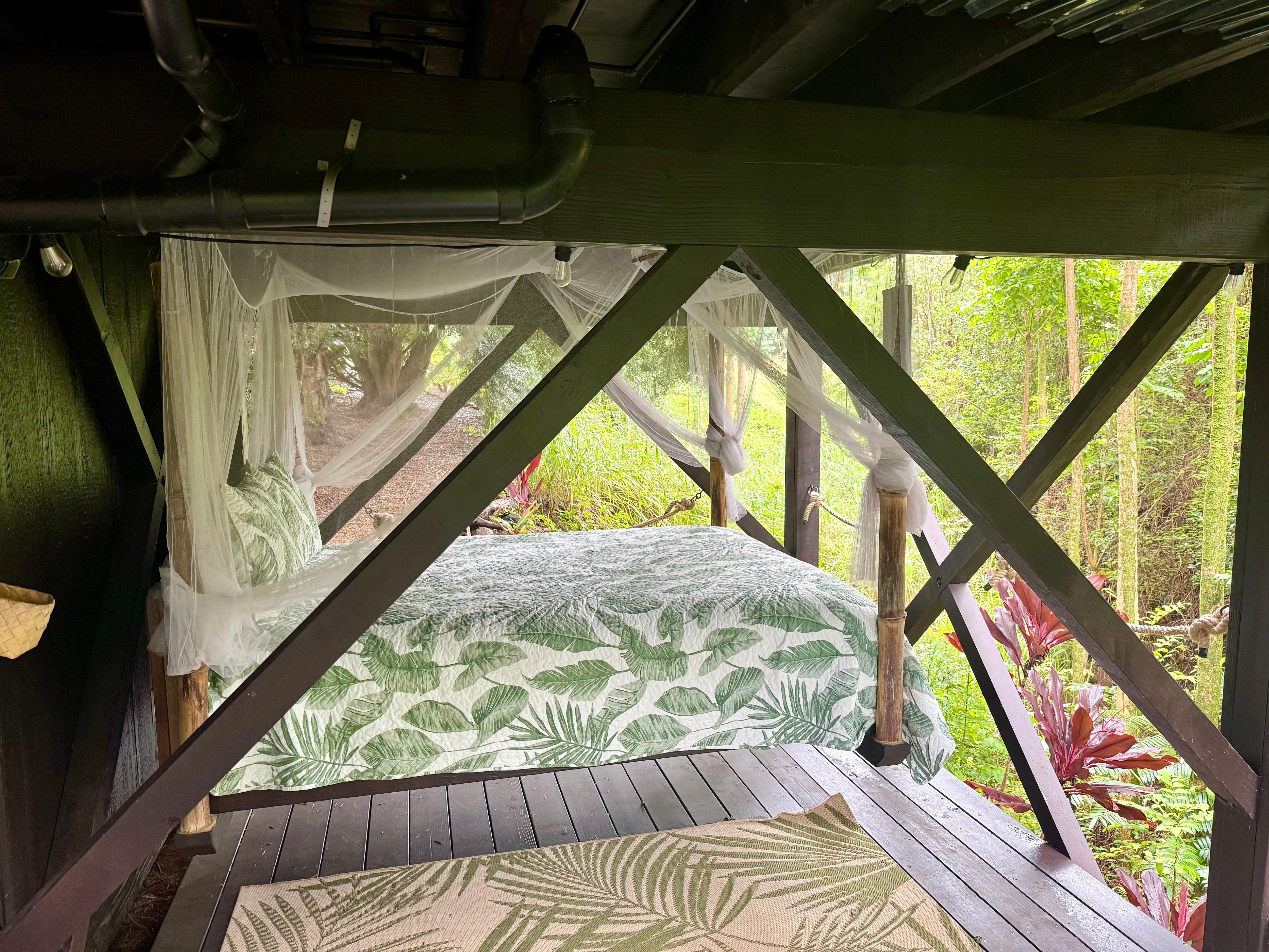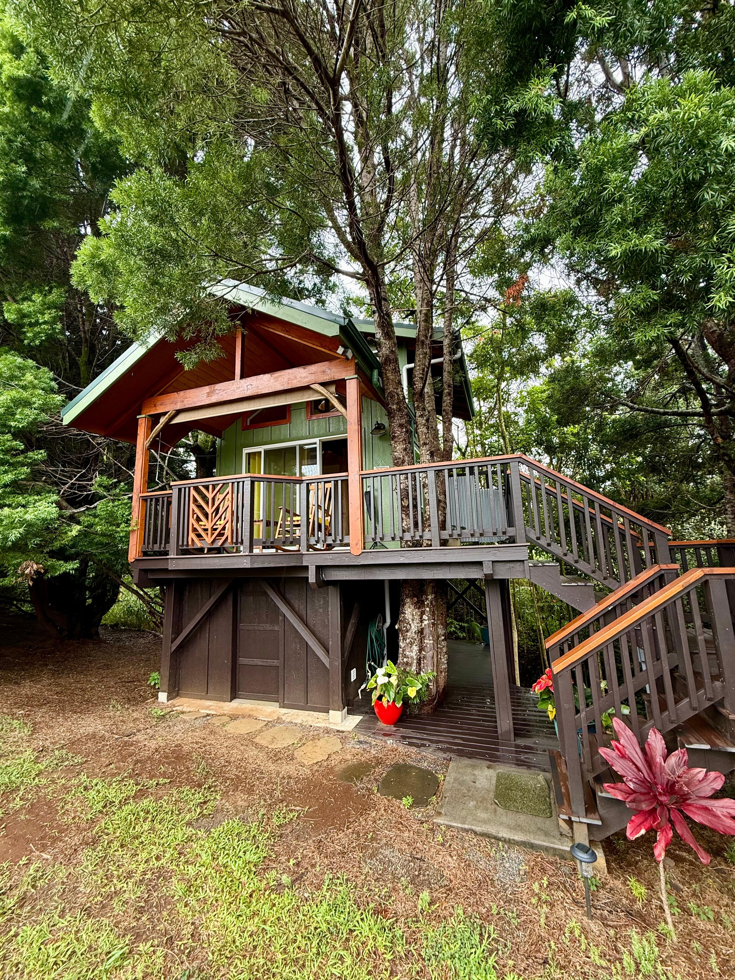 Hulili Farm's bright, airy and brand new Treehouse perfectly combines childhood dreams with luxury and comfort. Cozy up in your Sleep number bed, looking up at the trees and stars. Make meals in your fully equipped kitchen and enjoy dining on the open lanai. Coffee as you watch the sun rise over the ocean is a must. Imagine washing off the day in the privacy of your carefully situated outdoor shower. This hot shower is secluded and private, while also allowing you to experience the jungle view.