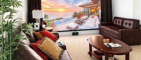 - Experience movie nights like never before in the luxurious theater room. With seating for 9 in plush recliners, leather chairs, a large screen, and a surround sound system, youâll feel as though youâre in a real cinema. Enjoy your favorite films and create lasting memories with friends and family.