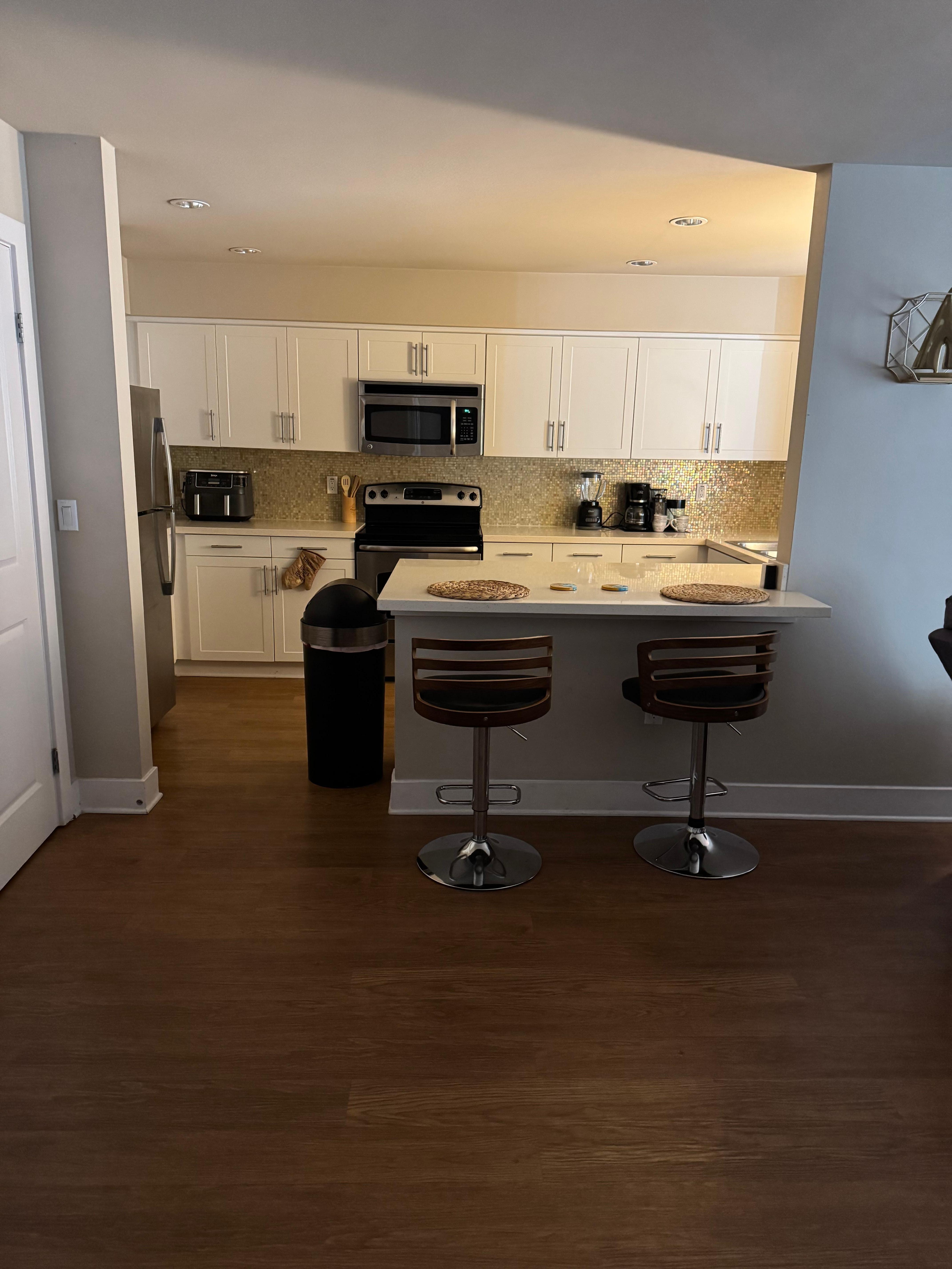 Cook like home with a full-size fridge, dishwasher, stove, microwave, and all essentialsâfrom a coffee machine to a toaster. The bar counter seats 4 comfortably for meals or morning coffee chats.