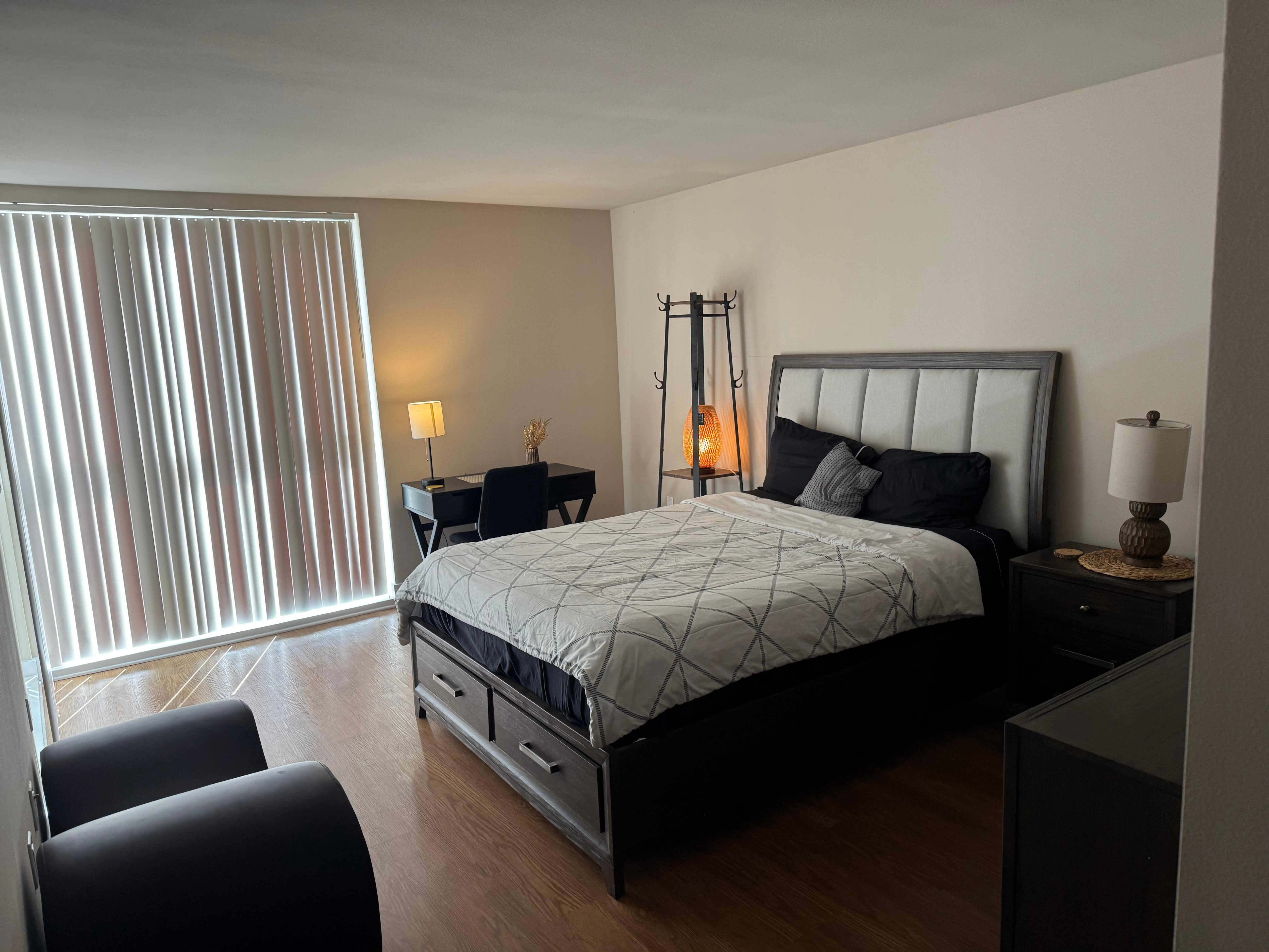 A queen bamboo pillow-top mattress offers restful sleep, paired with a pool view, blackout curtains, and a second walk-in closet. Thereâs even a height-adjustable desk if you need to get work done.