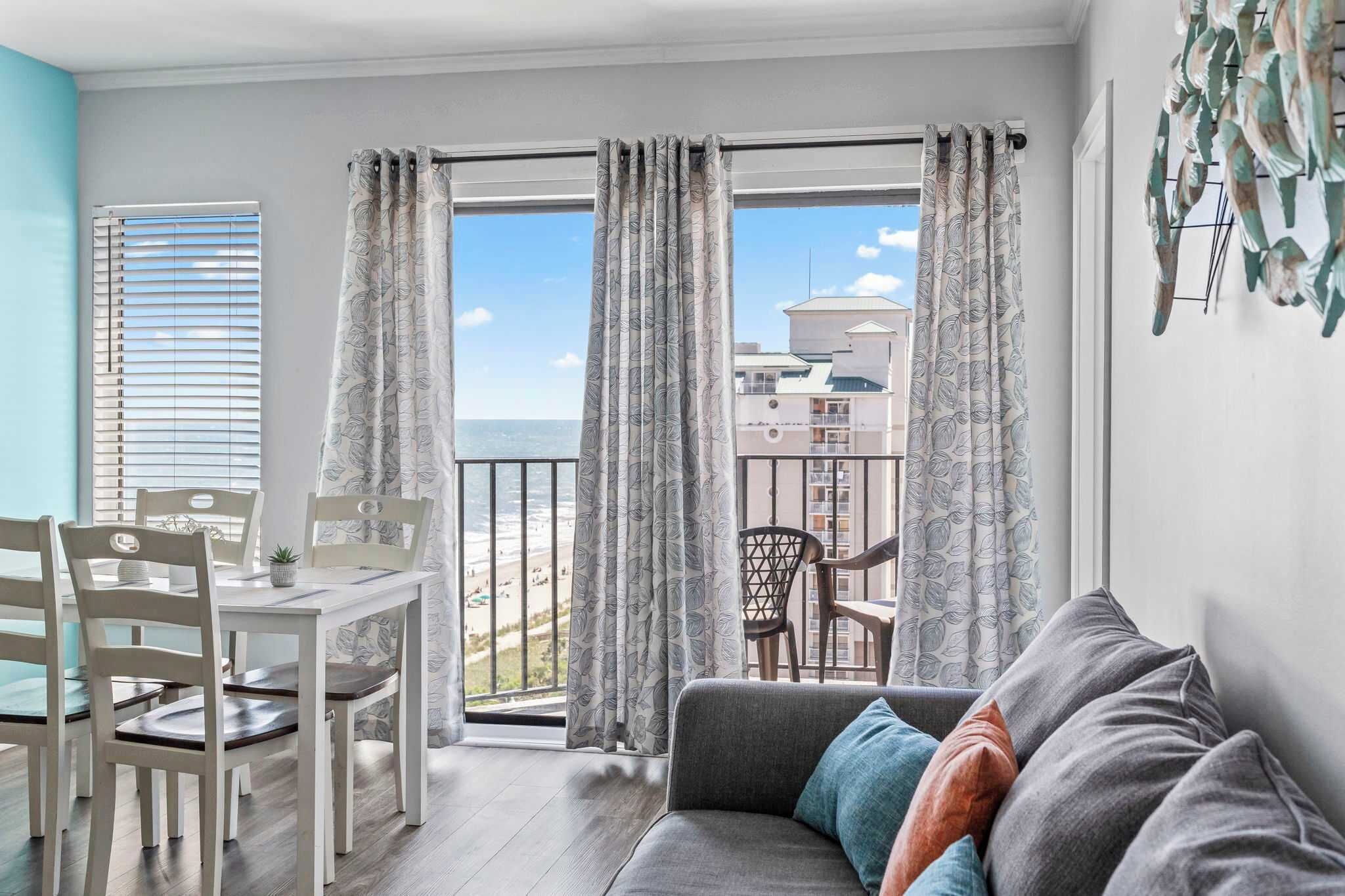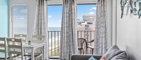 Just off of the kitchen is the living area. Furnished with a cozy sofa that folds into a sleeper sofa and two accent chairs, a coffee table, dresser that doubles as an entertainment stand with an oversized flat screen tv above, this space is perfect for gathering and unwinding after a long day out at the beach. Enormous windows allow light to flood the room, while a door off to the side allows access to the balcony, perfect for enjoying a glass of wine or a morning cup of coffee.