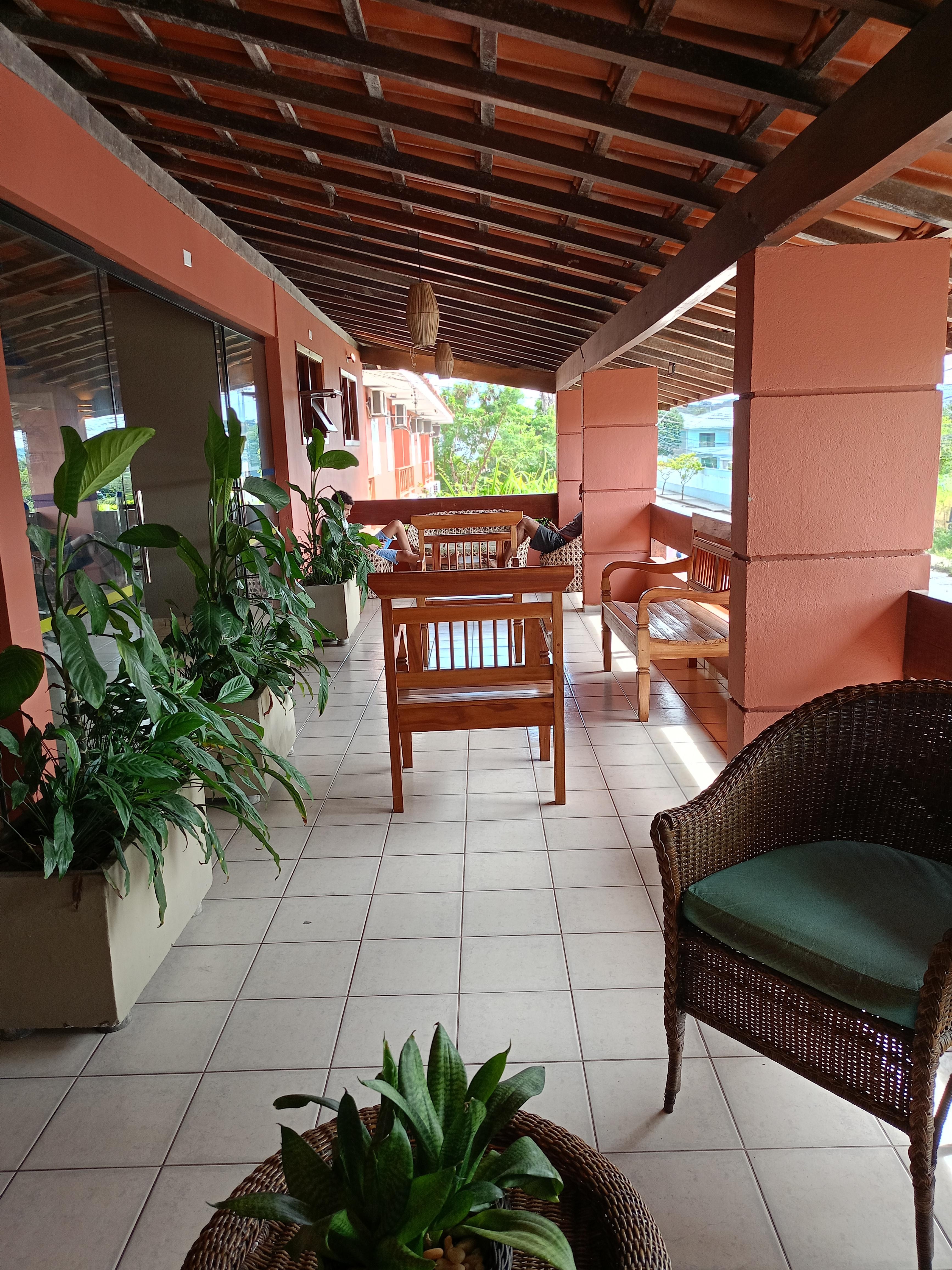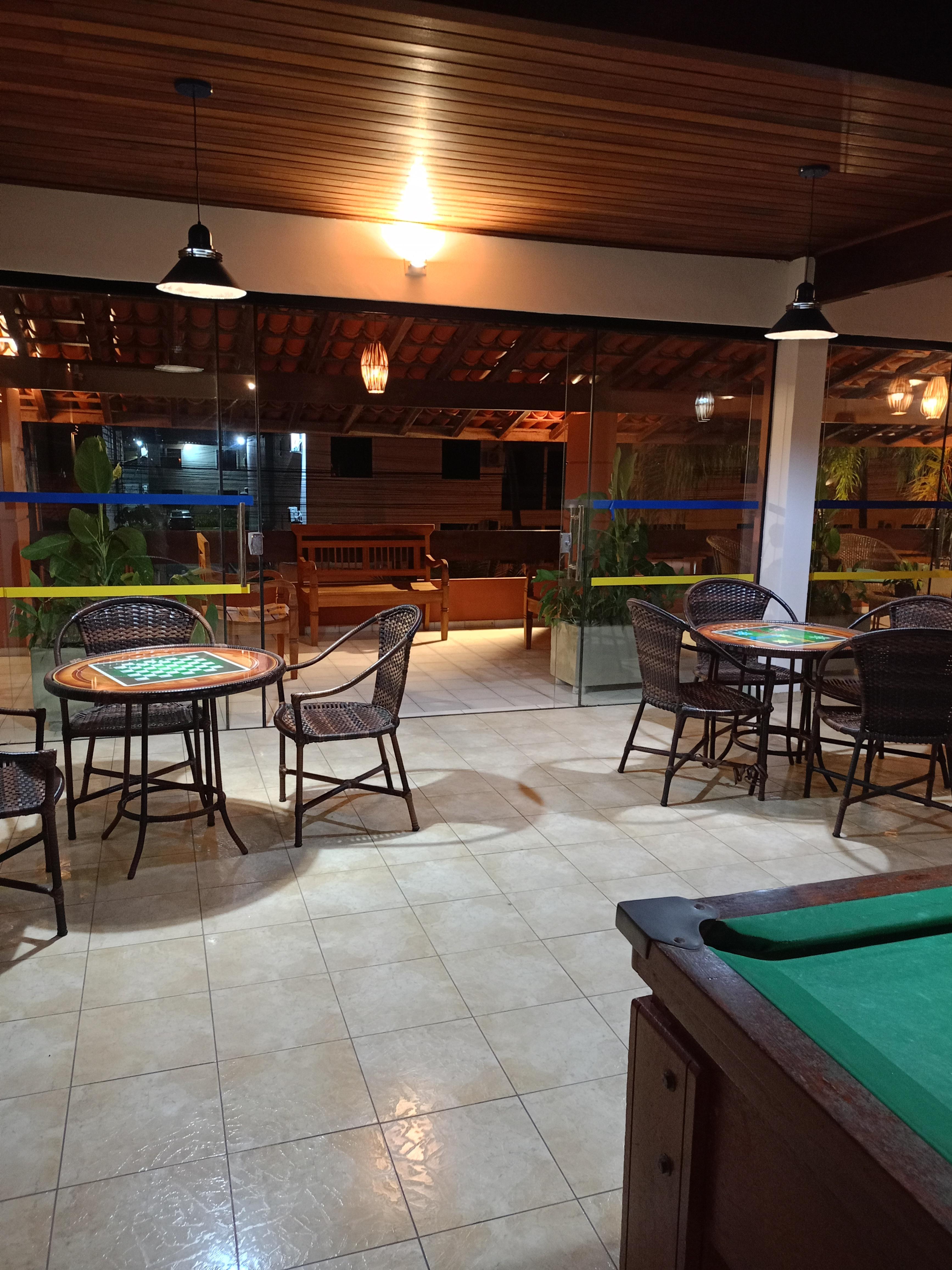 As comodidades do hotel são portaria, piscina e restaurante.