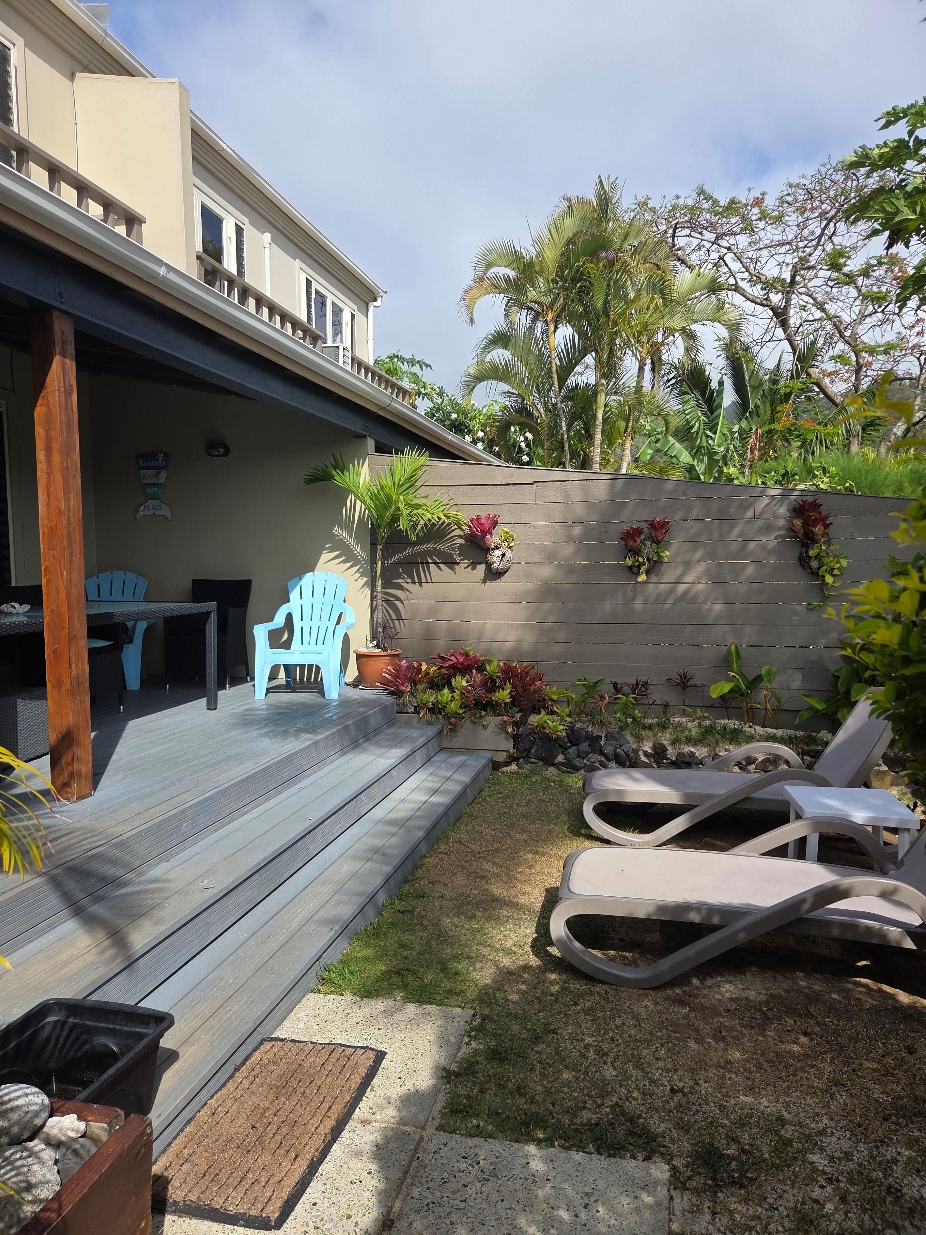 Genießen Sie Ihren eigenen landschaftlich gestalteten Innenhof mit Liegestühlen und einem hinteren Außenbereich, der zum berühmten Muri Beach führt!