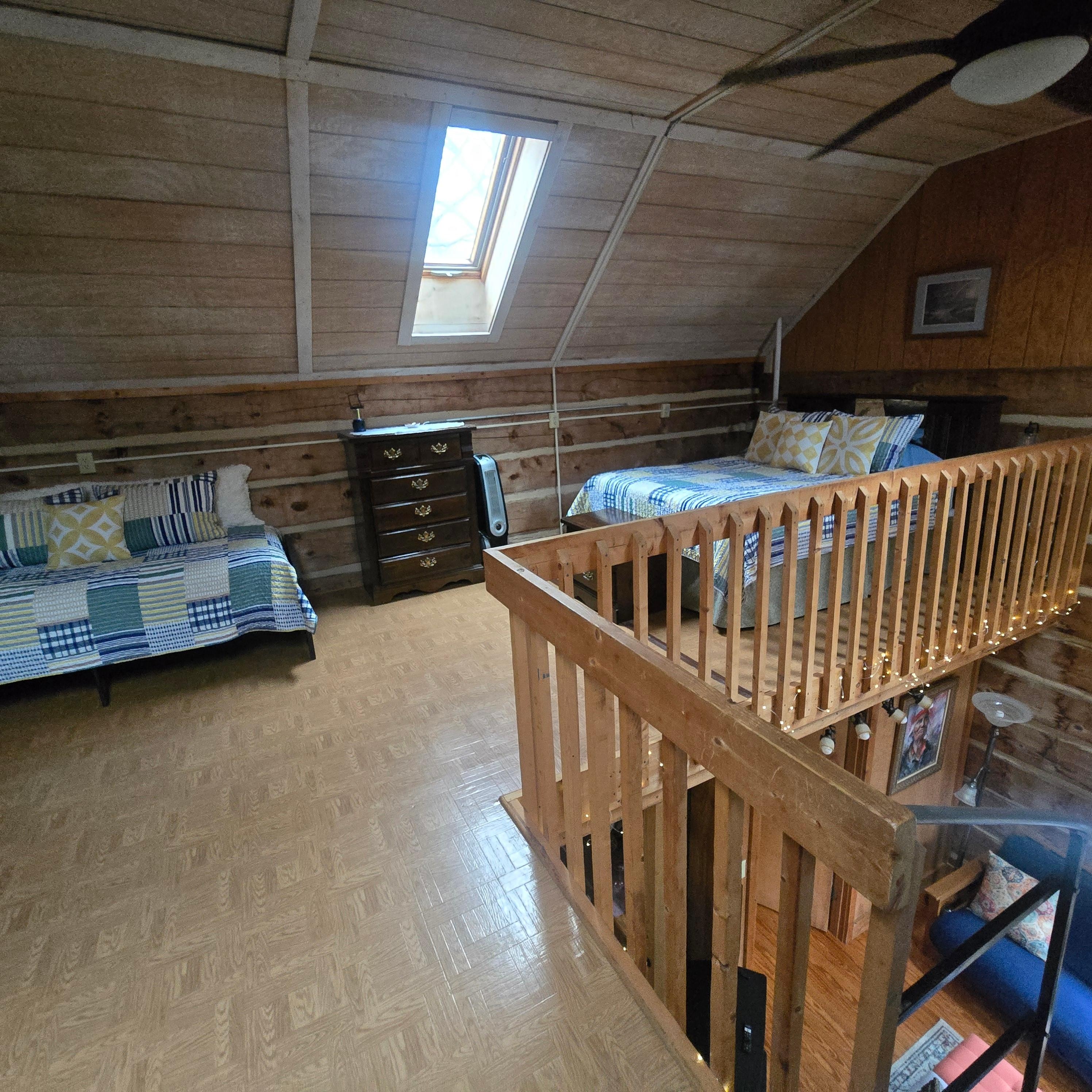 Spiral stairs lead up to the loft bedroom which will treat you to a rejuvenating night's rest letting natural sounds lull you to sleep. (1 queen bed and 1 twin bed in loft, double/full size futon downstairs) Please note the stairs make this cabin unsuitable for small children and those with mobility or balance challenges. I love children but this isn't a good place to stay if traveling with young ones or those with balance concerns.