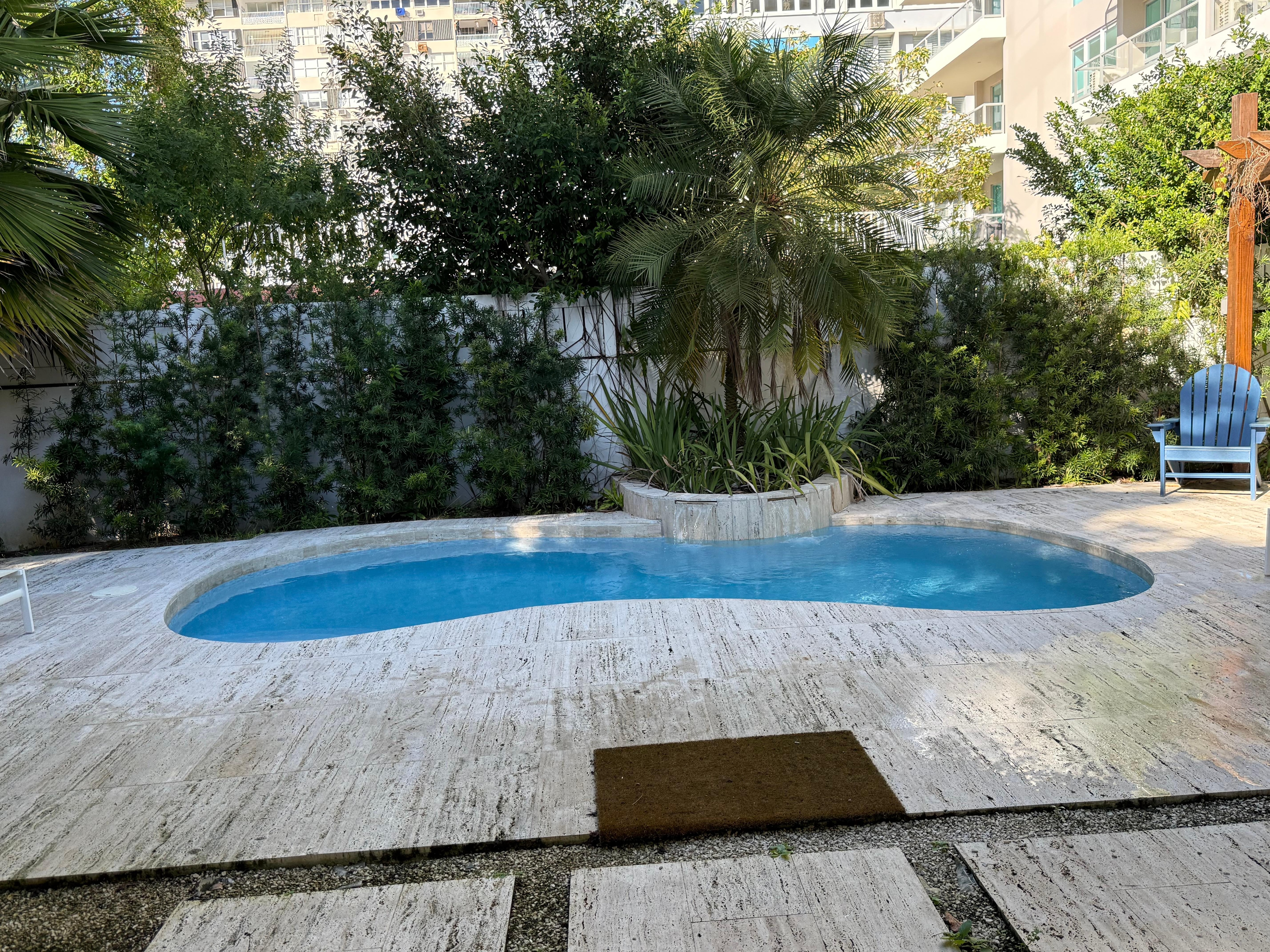 This house is beautiful and suited our needs perfectly. We had four couples staying here and there was plenty of room for everyone. From a mainland American perspective, the neighborhood is not very scenic, but it is close to two amazing beaches and many restaurants/bars. Despite being in an urban setting, the backyard is a tropical oasis. It had a lot of vegetation including a mango tree and a flamboyant tree. The coquis and other animals gave a good chorus. The pool and patio were perfect for relaxing. We enjoyed watching the planes take off at the beach but the engine noise is definitely in range at the house.