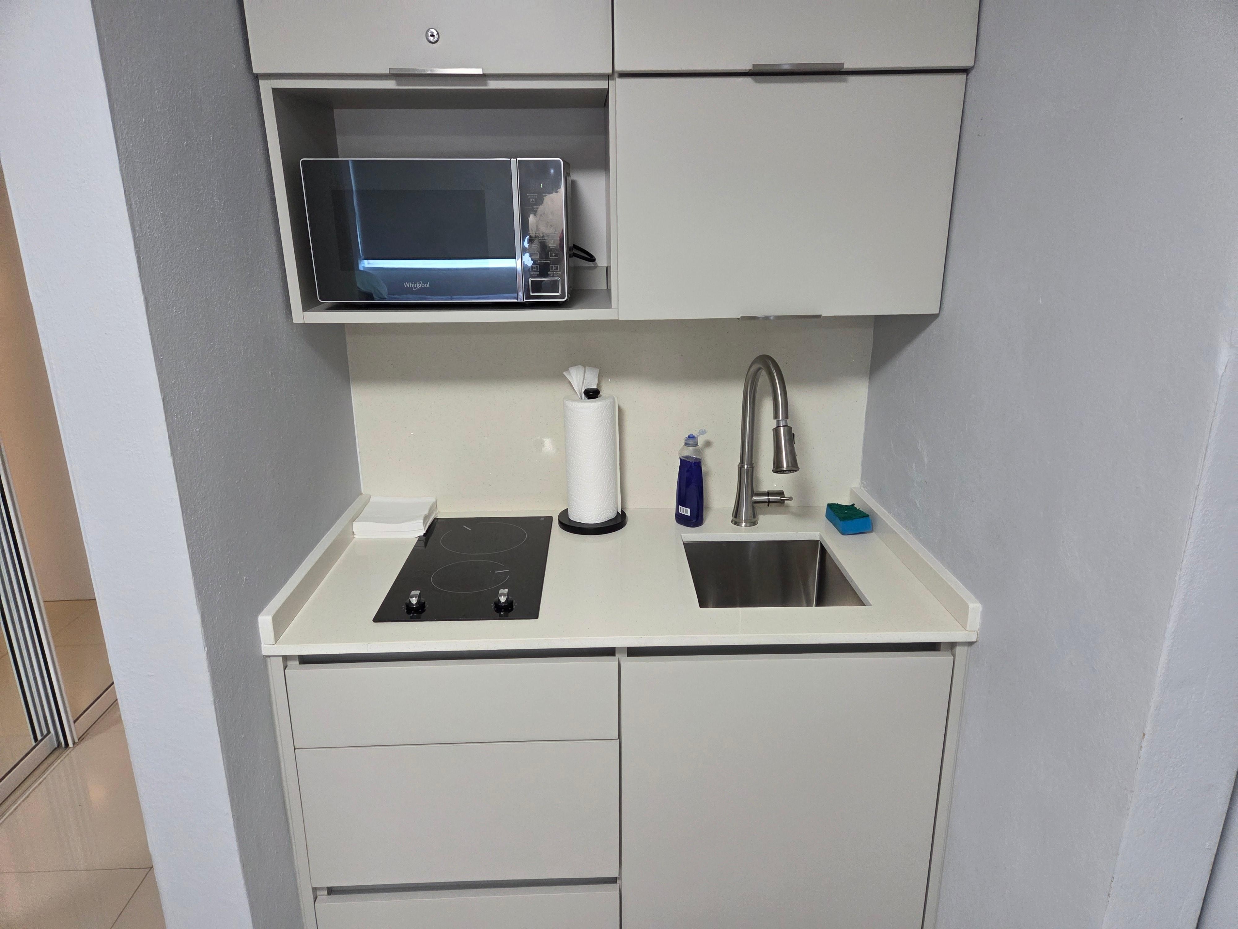 This condo is clean and freshly renovated with strong AC, fast WiFi, a workspace with amazing view, a new TV and a half kitchen.