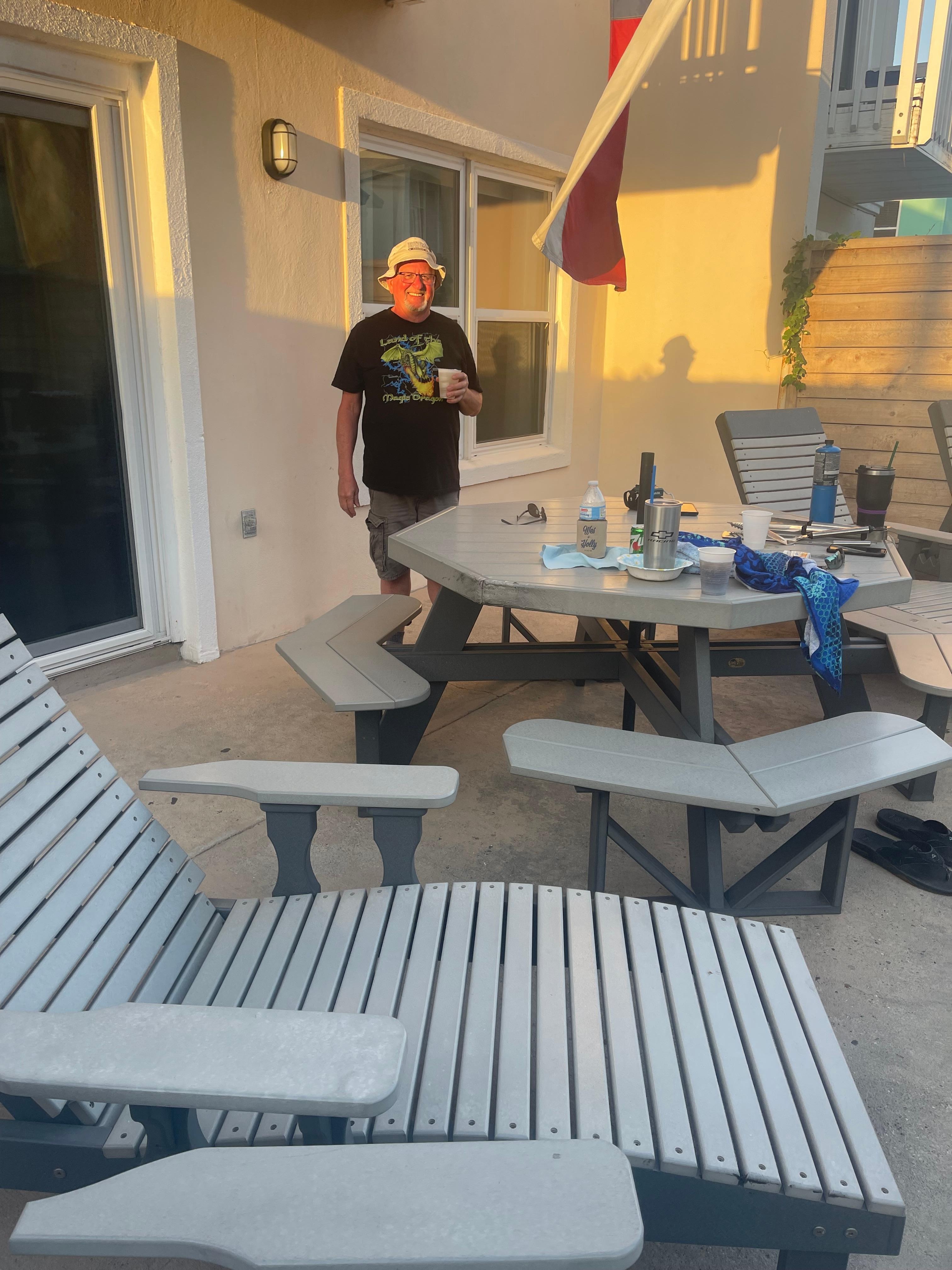 Our private backyard is designed to enhance an unforgettable South Padre Island beachcation. The sparkling pool, which can be heated in cooler months, glistens under the bright blue skies and reflects the towering palm trees. Surrounding the pool, comfortable lounge chairs beckon for sunbathing and leisurely afternoons. A BBQ pit stands ready to grill up delicious meals, while a picturesque picnic table with an umbrella provides the perfect spot for enjoying food and conversation in the shade. The backyard has endless summer vibes any time of year.
