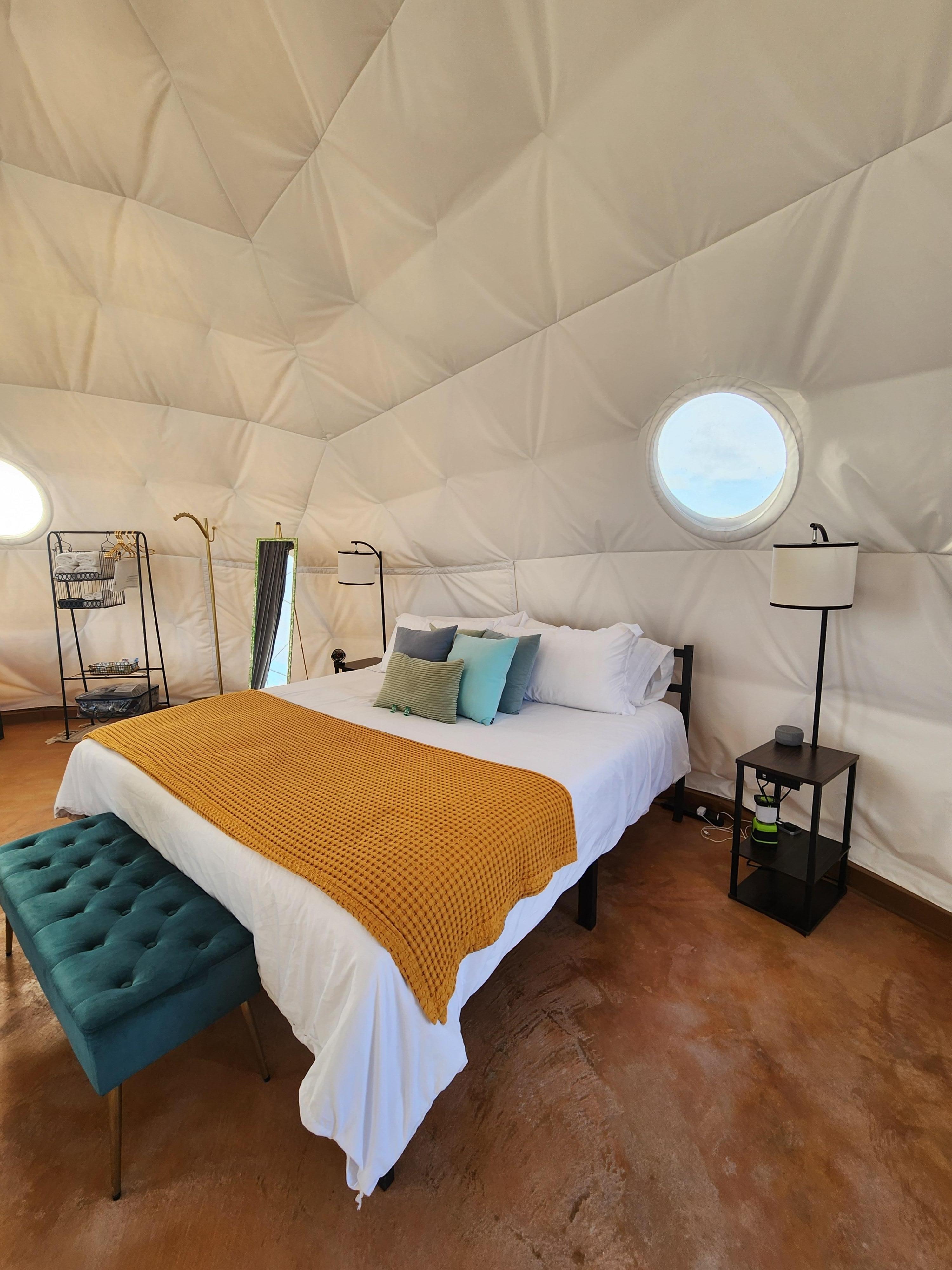 The El Rio is available as an elegant 695-square-foot insulated dome and a luxurious king bed. The dome comes with Air Conditioning and Heat. It features a clean, southern boho setting that opens onto your very own private patio. Inside, the large bay window faces the south, where sunrise and sunsets over wondrous skies are nothing but magical.